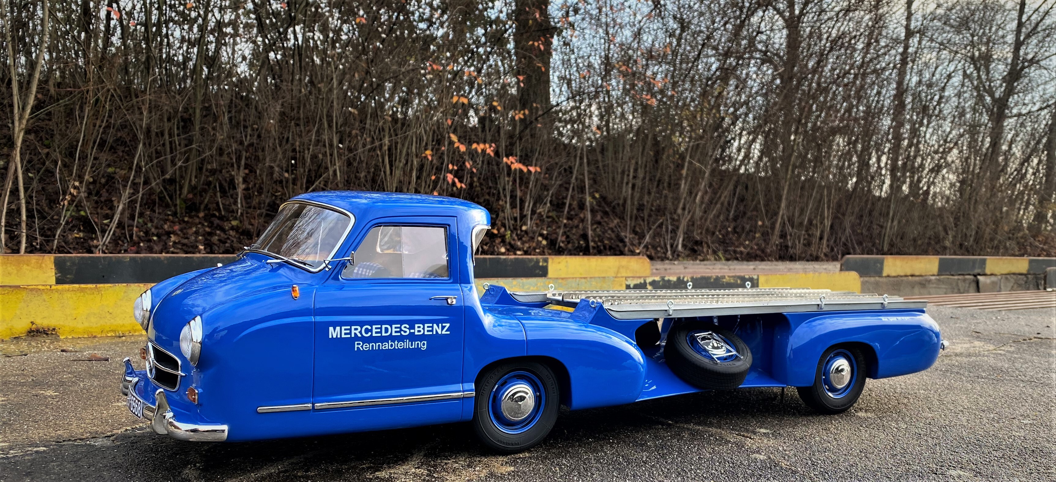 Ein Renntransporter, der seinem Transportgut die Schau stahl – das war das „Blaue Wunder“ von Mercedes, das Karsten Schmidt als begeisterter Fan von Rennfahrzeugen diese Epoche im Maßstab 1:8 bauen musste – und das absolut meisterhaft.