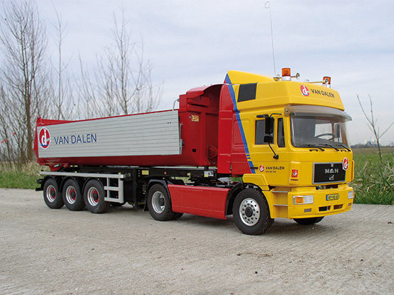 Einen außergewöhnlichen Trailer – zudem noch mit Funktionen – zu bauen war das Ziel von Harry Bisseling. Sein Kipper, bei dem sogar die Abdeckklappen auf der Oberseite ferngesteuert bewegt werden, ist ein echtes Highlight, für das sogar das Original gewaschen wurde.