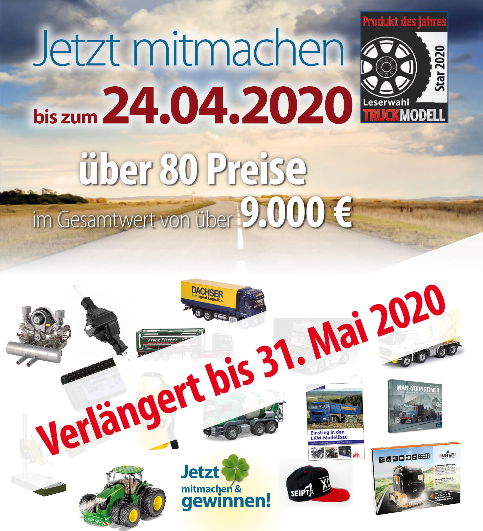 Aufgrund der Corona-Pandemie kann in diesem Jahr die Verleihung der TruckMODELL-Stars leider nicht wie geplant stattfinden, weshalb wir den Teilnahmeschluss für die Leserumfrage bis zum 31.5.2020 verlängert haben. Unter allen Teilnehmern verlosen Preise im Gesamtwert von über 9.000 Euro