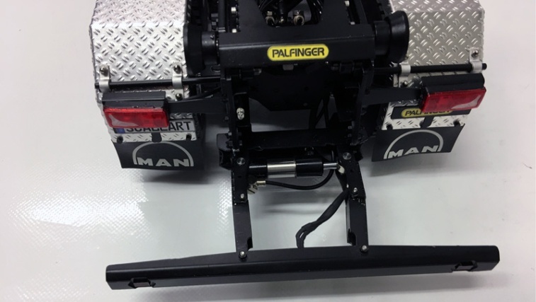Die teleskopierbare Stoßstange ist speziell für Abrollkipper zum Ausgleich von überhängenden Behältern geignet. Die Stoßstange verfügt zusätzlich über zwei Rückleuchten und Seitenbegrenzungsleuchten welche in der Stoßstange eingelassen sind. Sie lässt sich auch in bestehenden Meiller Abrollkippern nachrüsten, allerdings benötigt man dann auch die neue Ventilbox. Als Bausatz mit Anleitung erhältlich ab ca. April 2017, bei Bestellung eines fertig aufgebauten Modells ab sofort.
