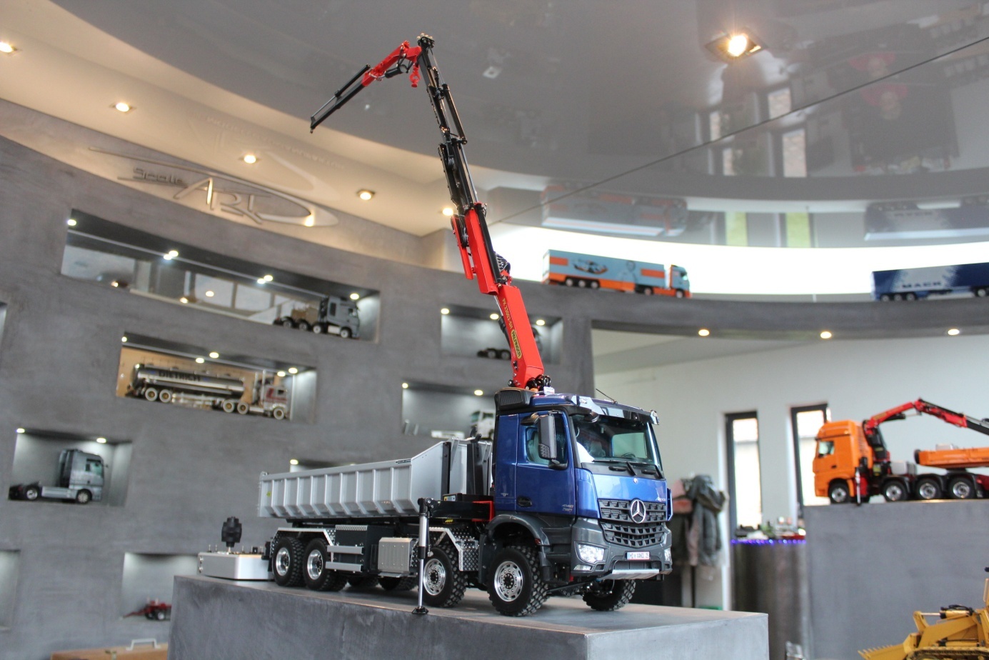Teleskopierbarer Arm mit zusätzlichem Knickarm. Der Abrollkippaufbau benötigt drei Steuerventile für Hub, Teleskop und Knickarm. Zusätzlich können zwei Halteventile zur Erhöhung der Betriebssicherheit und ein viertes Ventil für die teleskopierbare Stoßstange (Unterfahrschutz) eingebaut werden. Als Bausatz mit Anleitung erhältlich ab ca. April 2017, bei Bestellung eines fertig aufgebauten Modells ab sofort.